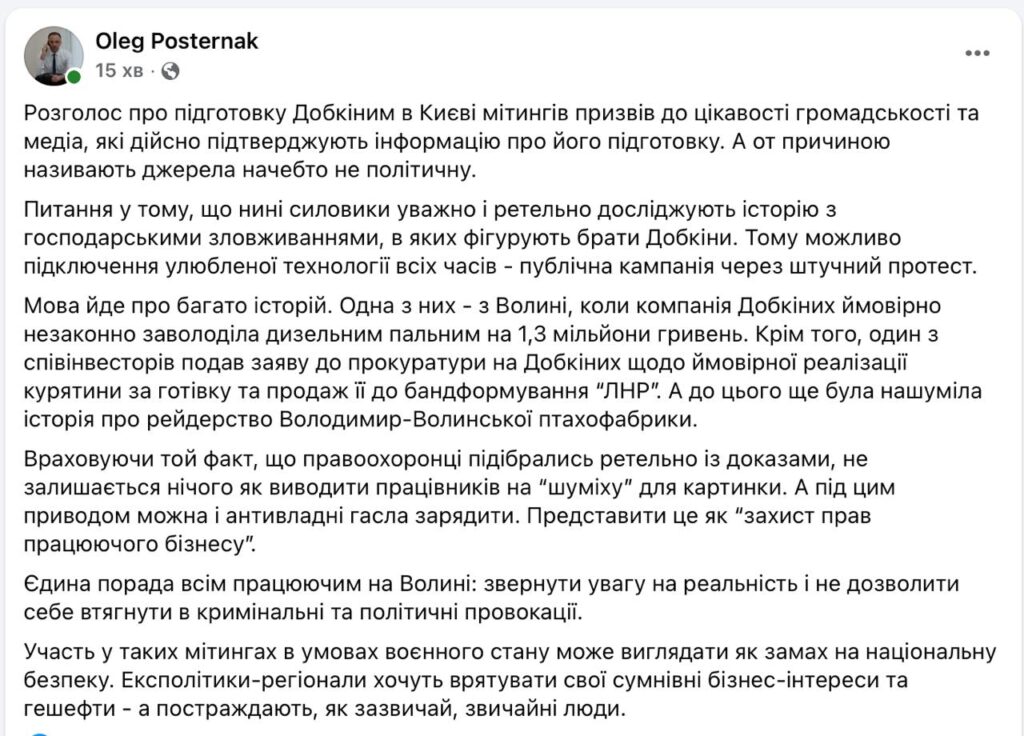Постернак нагадав, що правоохоронці нині активно досліджують низку історій, де фігурують брати Добкіни: “Одна з них — з Волині, коли компанія Добкіних ймовірно незаконно заволоділа дизельним пальним на 1,3 мільйони гривень. Крім того, один зі співінвесторів подав заяву до прокуратури на Добкіних щодо ймовірної реалізації курятини за готівку та продаж її до бандформування “ЛНР”. А до цього ще була нашуміла історія про рейдерство Володимир-Волинської птахофабрики”.