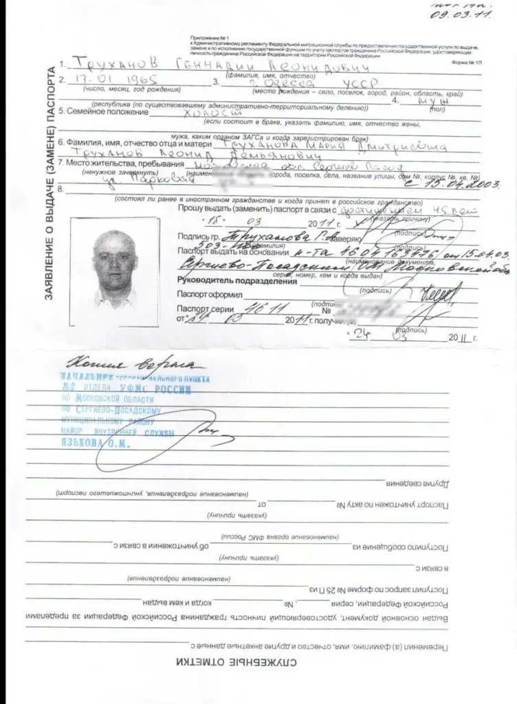 Видання The Insider, з яким співпрацює журналіст, наводить дані з російських баз даних, згідно з якими у Труханова дійсно було два російські паспорти. Перший, номер якого починається з 4604, виданий 15 квітня 2003 року і втрачений. Другий, номер якого починається з цифр 4611, видано 24 березня 2011 року ГУ МВС у Московській області “замість втраченого”. У заяві на видачу цього паспорта значиться, що заміна здійснена “у зв’язку з досягненням 45-річного віку”.