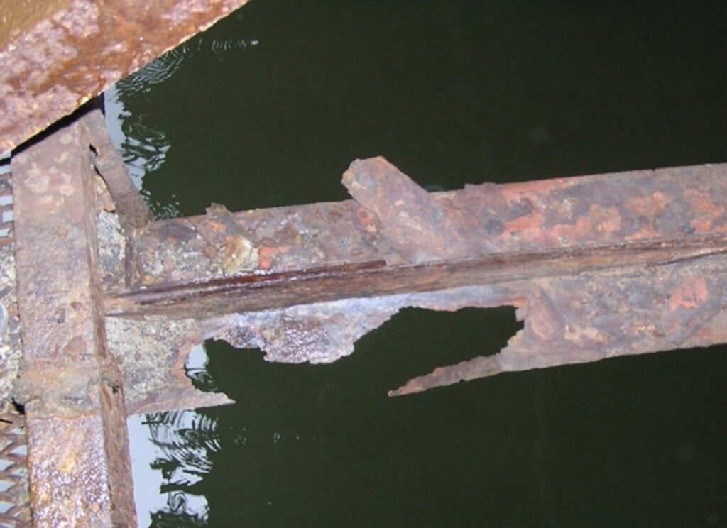 Зокрема в конструкціях зафіксовано критичні корозійні пошкодження головних і поперечних балок, а також численні тріщини у з’єднаннях поясів і стінок. Метал поперечних елементів, які безпосередньо тримають плити проїзної частини, прокородував майже повністю.