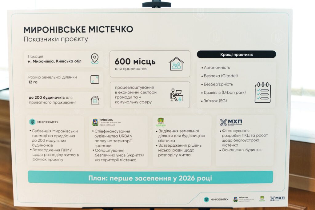 У Миронівській громаді Київської області стартує пілотний проєкт зі створення модульного житлового містечка для внутрішньо переміщених осіб із паралельним працевлаштуванням мешканців. Відповідний чотиристоронній Меморандум про взаєморозуміння та співпрацю було підписано за участі голови Київської обласної державної адміністрації Миколи Калашника.