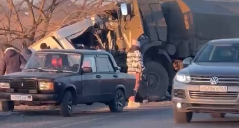 Але фотографії, які зробили очевидці з місця події, свідчать про те, що це російська військова вантажівка зіткнулася з пасажирським мікроавтобусом.