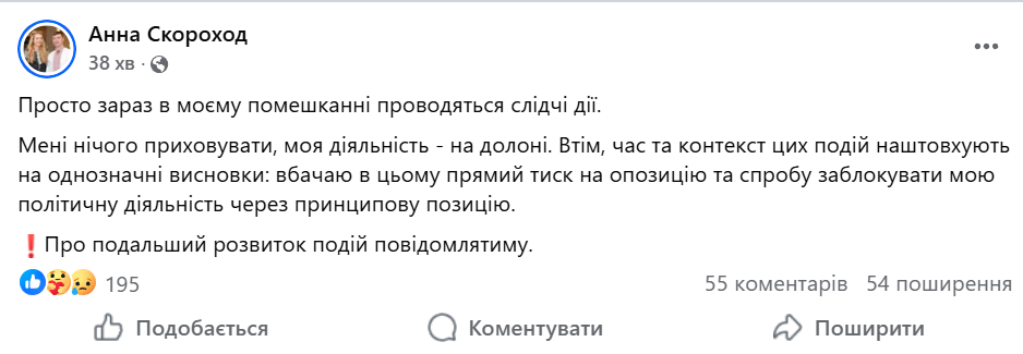 “Просто зараз в моєму помешканні проводяться слідчі дії. Мені нічого приховувати, моя діяльність – на долоні. Втім, час та контекст цих подій наштовхують на однозначні висновки: вбачаю в цьому прямий тиск на опозицію та спробу заблокувати мою політичну діяльність через принципову позицію. Про подальший розвиток подій повідомлятиму”, – написала вона.