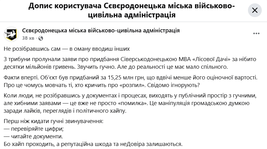 Сіверськодонецька МВА прокоментувала звинувачення Вельможного: “З трибуни пролунали заяви про придбання Сіверськодонецькою МВА “Лісової Дачі” за нібито десятки мільйонів гривень. Звучить гучно. Але до реальності це має мало спільного”.