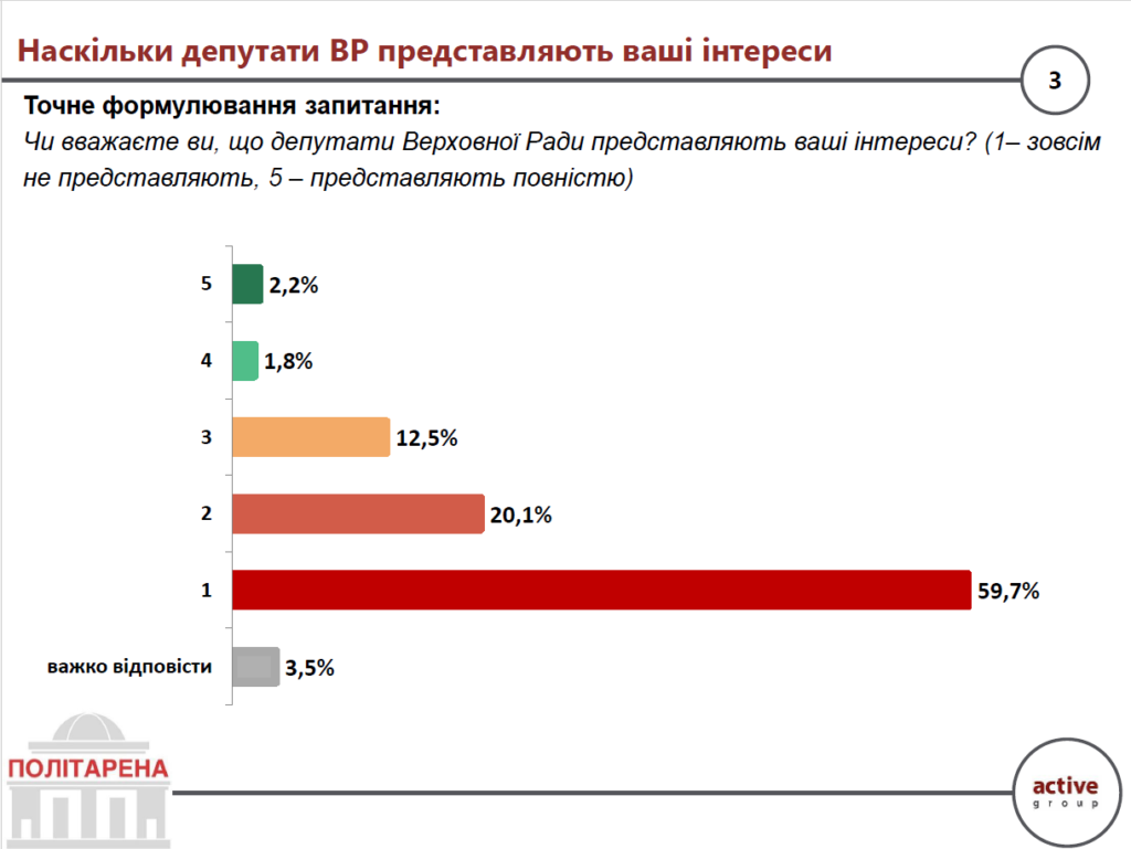 Так, на запитання, щодо того, чи депутати Верховної Ради представляють їхні інтереси: 59,7% обрали оцінку “1” за шкалою від 1 до 5, ще 20,1% – “2”, тоді як позитивні оцінки “4” і “5” сумарно набирають менш як 4%. Лише близько 12,5% оцінили представництво своїх інтересів на “3”, а 3,5% утрималися від визначеної відповіді.