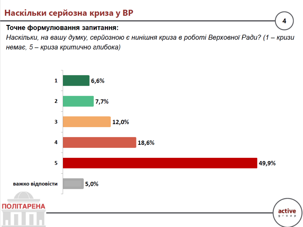 Щодо серйозності нинішньої кризи в роботі парламенту, майже половина опитаних (49,9%) вважають, що криза є “критично глибокою” (оцінка “5”), а ще 18,6% оцінили її на рівні “4”.