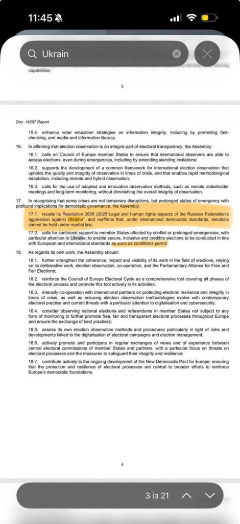 • підтверджено в пункті 17.1, що відповідно до міжнародних демократичних стандартів вибори не можуть проводитися в умовах воєнного стану, з посиланням на Резолюцію ПАРЄ 2605 (2025);