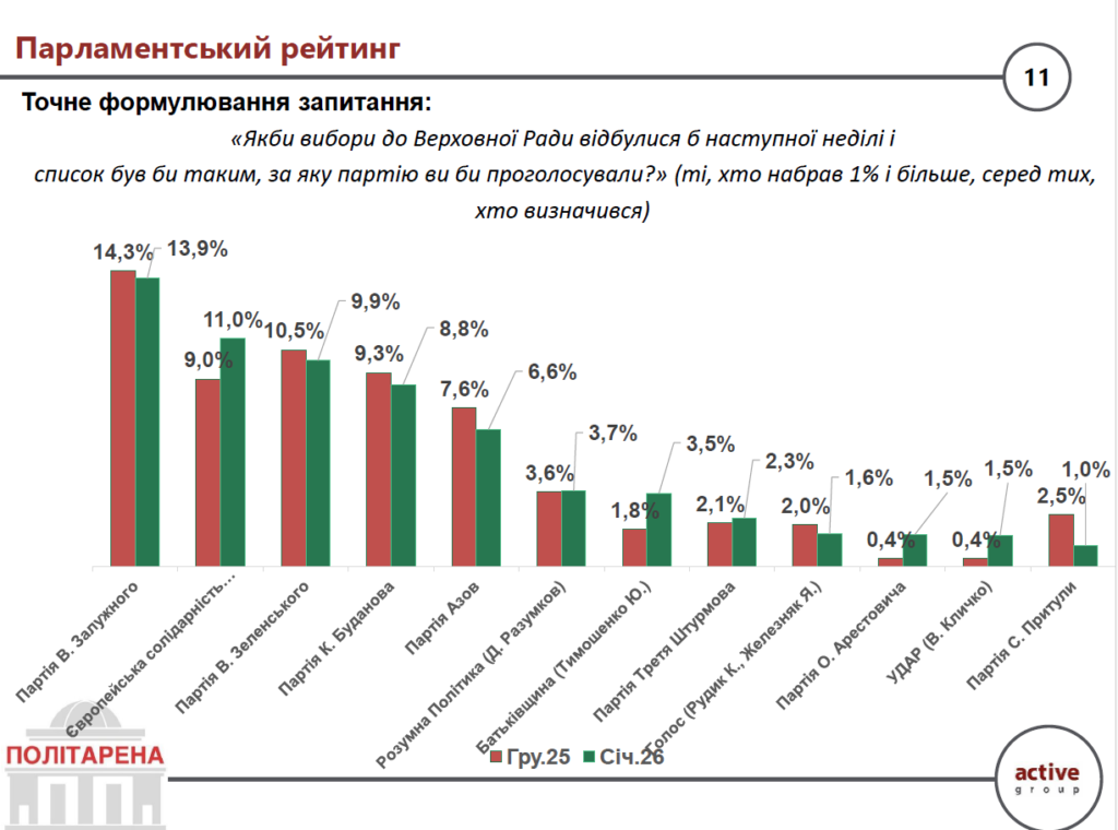 Найвищий рівень підтримки серед партій, що долають прохідний поріг, отримує потенційна “Партія Валерія Залужного”(13,9%). Далі з незначним відривом ідуть Європейська солідарність (11,0%), Партія Володимира Зеленського (9,9%) та потенційна “Партія Кирила Буданова” (8,8%).