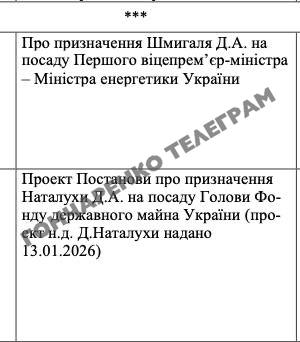За словами Железняка, окрім питання Міненерго, депутати розглянуть низку інших важливих рішень, серед яких призначення Михайла Федорова міністром оборони України, продовження дії воєнного стану та загальної мобілізації, а також призначення народного депутата Дмитра Наталухи головою Фонду державного майна
