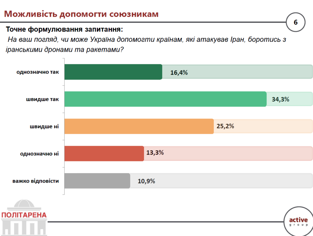 Ідея технічної або військово-технологічної допомоги Україні союзникам, які зазнають атак з боку Ірану, отримала помірну підтримку. Половина громадян (50,7%) вважає, що Україна може допомогти країнам, які стали об’єктом іранських атак, насамперед у протидії дронам і ракетам. Водночас чверть (25,2%) висловили сумнів у доцільності такої участі, а 13,3% категорично проти.
