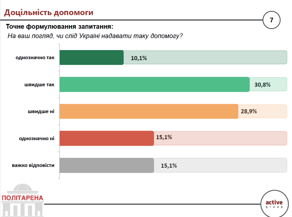 Коли мова заходить про необхідність надання такої допомоги, позиції стають ще обережнішими: 40,9% підтримують її в тій чи іншій формі, майже стільки ж (44%) – схиляються до відмови, решта (15,1%) не визначилися.