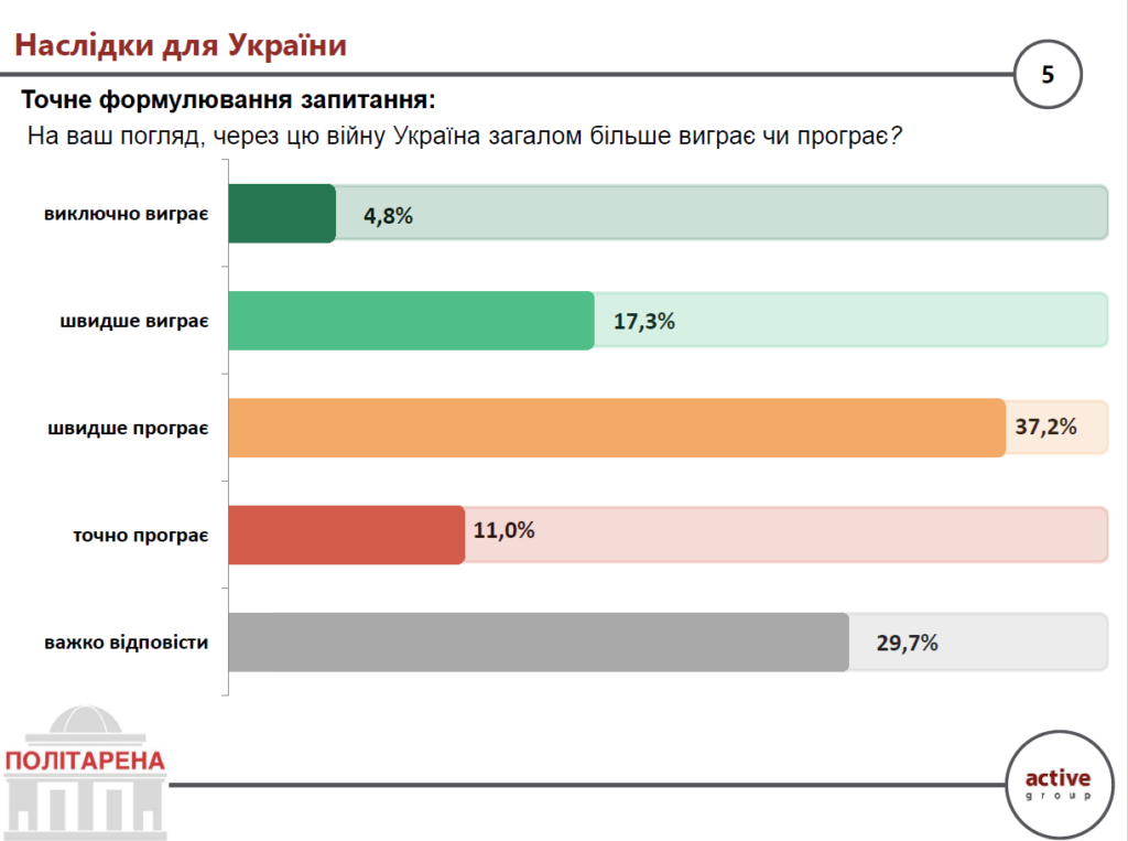 В оцінках впливу нової війни на власну державу українці демонструють скепсис: лише 22,1% опитаних вважають, що Україна більше виграє (зокрема 4,8% – “виключно виграє”), тоді як 48,2% переконані у зворотному (зокрема 11% – що “точно програє”). Ще 29,7% не змогли дати однозначну відповідь.