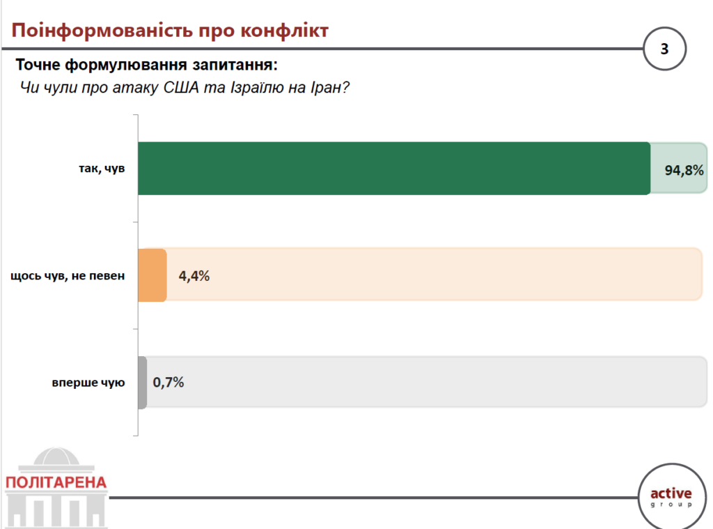 Подія, що викликала найбільший резонанс минулого тижня – спільна атака США та Ізраїлю на Іран – не залишилася поза увагою українського суспільства. Про неї чули майже всі опитані: 94,8% респондентів заявили, що знають про конфлікт, ще 4,4% – щось чули, але не впевнені у деталях. Лише 0,7% відповіли, що чують про це вперше.
