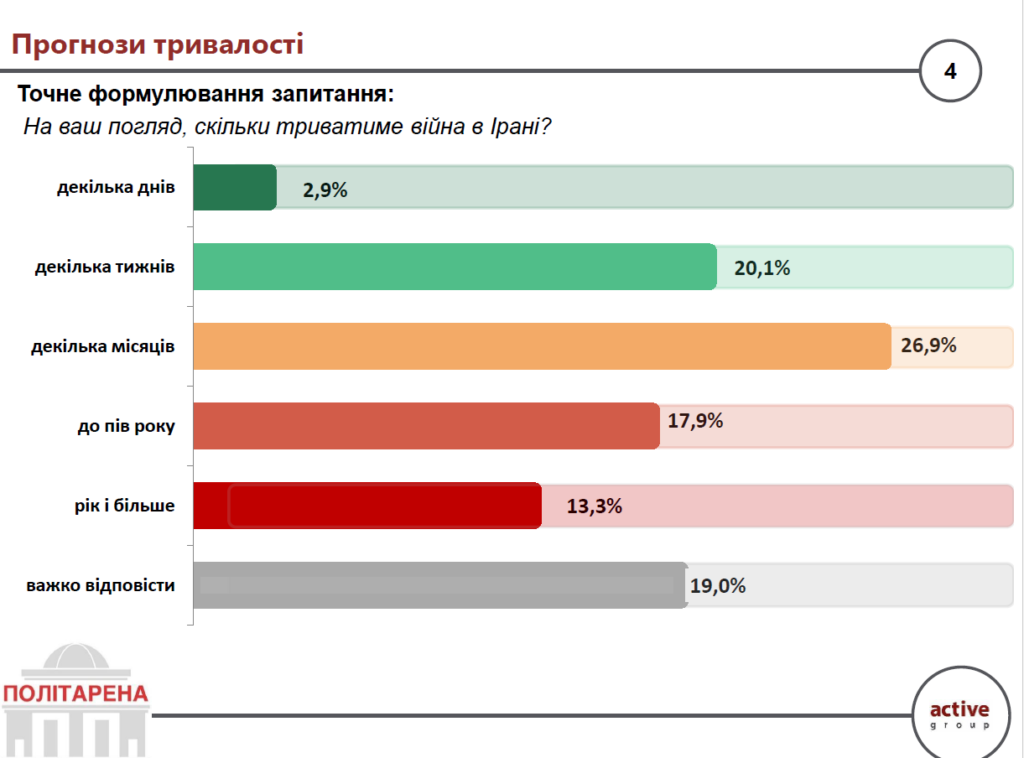 Українці не схильні вірити у швидке завершення бойових дій між Іраном та його опонентами. Тільки 2,9% вважають, що протистояння триватиме кілька днів, ще 20,1% – кілька тижнів. Найбільша частка опитаних (26,9%) очікує, що війна затягнеться на кілька місяців, а ще 17,9% – до пів року.