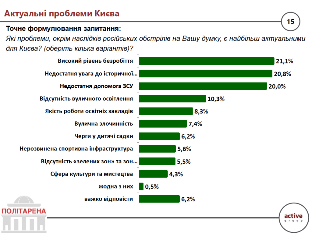 Крім того, кияни звертають увагу на якість доріг (22,3%) і відсутність паркувальних місць (21,3%), високий рівень безробіття (21,1%).