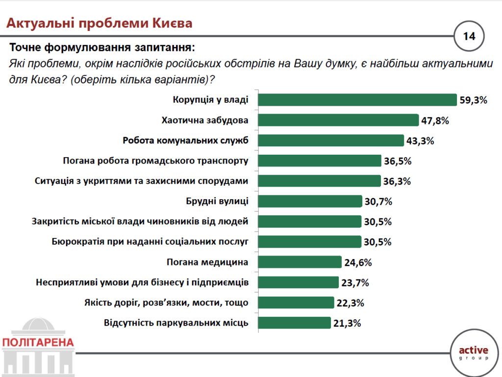 Найбільш актуальними проблемами для Києва мешканці вважають корупцію у владі (59,3%), хаотичну забудову (47,8%), роботу комунальних служб (43,35%).