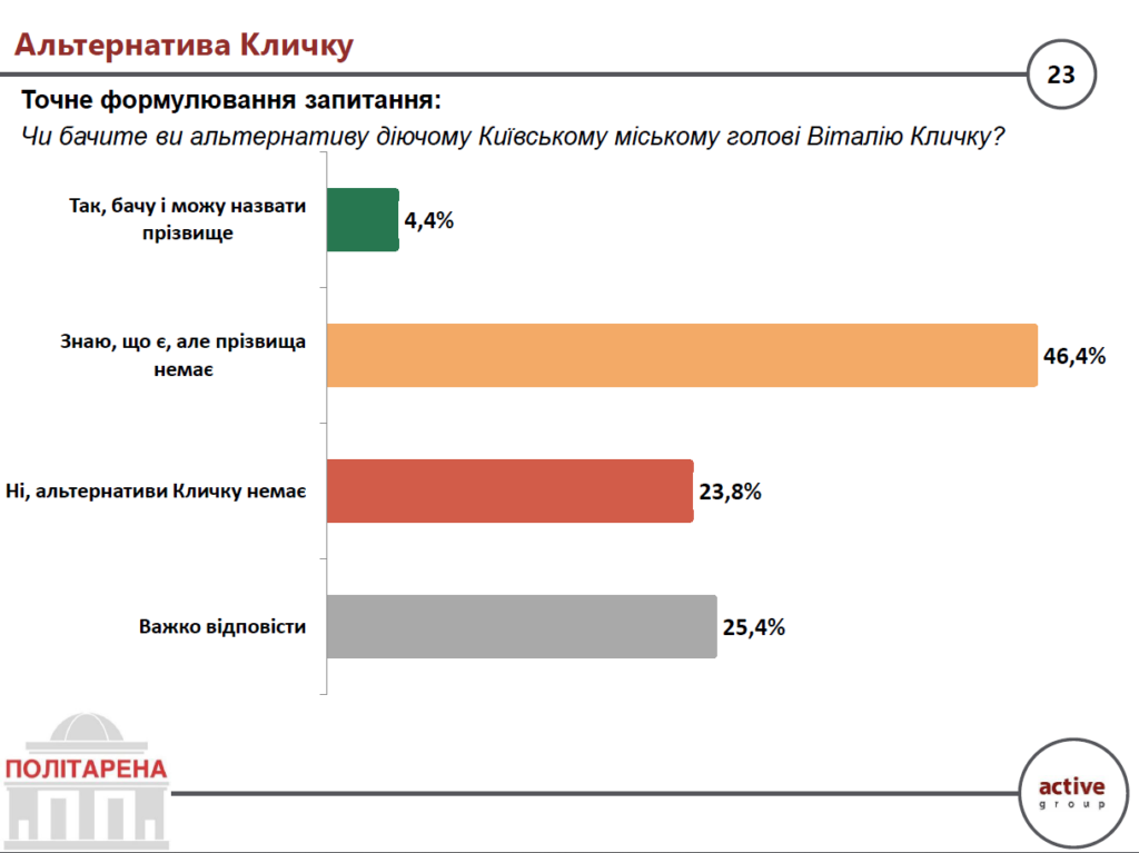 Лише 4,4% респондентів заявляють, що бачать альтернативу і можуть назвати конкретне прізвище. Водночас майже половина опитаних (46,4%) переконані, що альтернатива існує, але не можуть її персоніфікувати. Ще 23,8% вважають, що альтернативи Віталію Кличку взагалі немає, а чверть киян (25,4%) не визначилися з відповіддю.