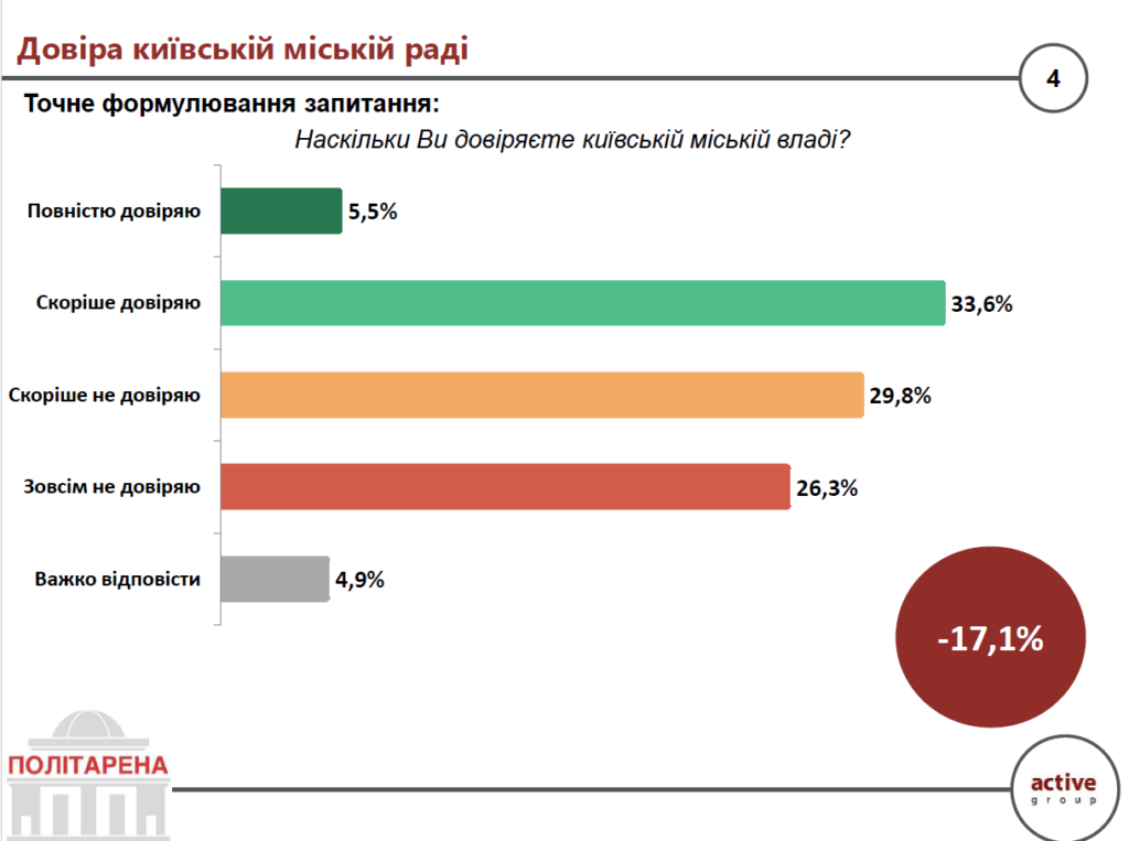 Довіряють міській раді сукупно 39,1% киян, не довіряють – 56,1%. Ще 4,9% важко відповісти на це питання.