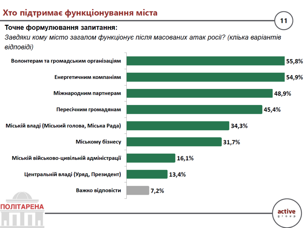 Водночас у відповідях на запитання про те, завдяки кому Київ загалом функціонує після масованих атак, домінують не владні інституції, а горизонтальні та зовнішні діячі.