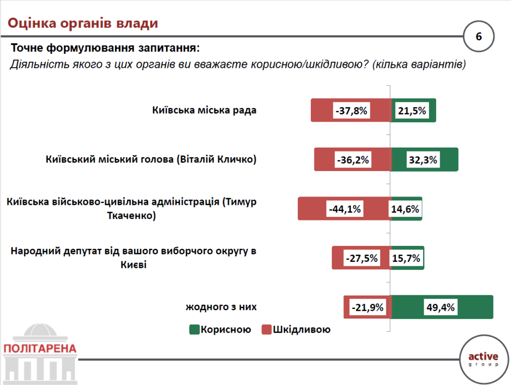 Оцінка діяльності ключових міських інституцій демонструє глибоку кризу сприйняття. Майже половина киян (49,4%) не вважають корисною діяльність жодного з перелічених органів міської влади. Водночас діяльність міського голови позитивно оцінюють 32,3%, Київської міської ради – 21,5%, Київської міської військово-цивільної адміністрації – лише 14,6%.