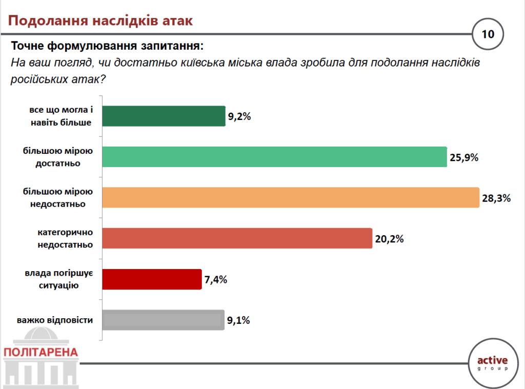 Оцінка дій київської міської влади щодо подолання наслідків російських атак також залишається переважно критичною.