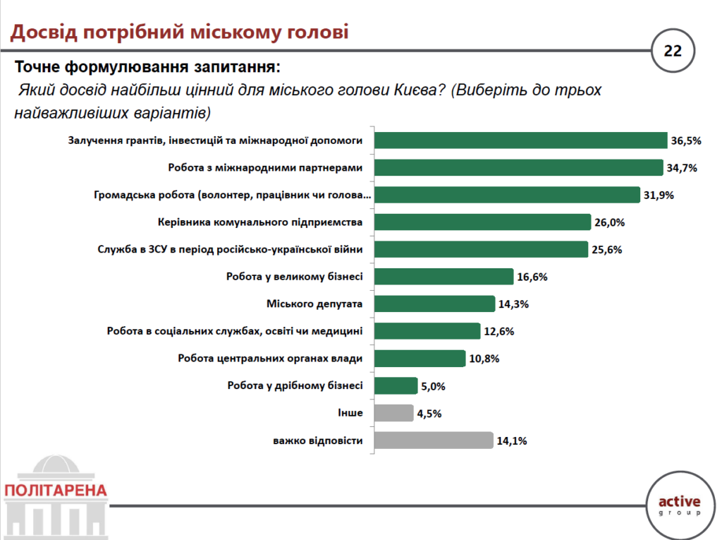 Найбільш цінним для мера Києва досвідом мешканці вважають залучання грантів та міжнародної допомоги (36,5%), роботу з міжнародними партнерами (34,7%), громадську роботу (31,9%).