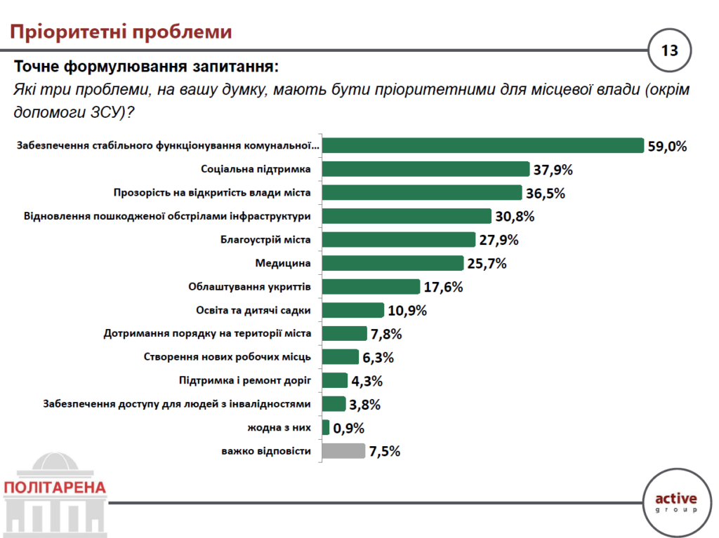 Більшість киян – 59% вважають, що для місцевої влади має бути пріоритетом забезпечення функціонування комунальної сфери, 37,9% вважають важливою соціальну підтримку, а 36,5% – прозорість і відкритість влади.