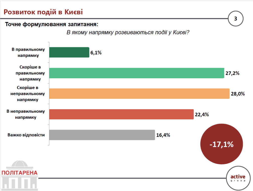 Натомість половина киян (50,4%) переконані, що місто рухається у неправильному або радше неправильному напрямку. Ще 16,4% не змогли визначитися з оцінкою.