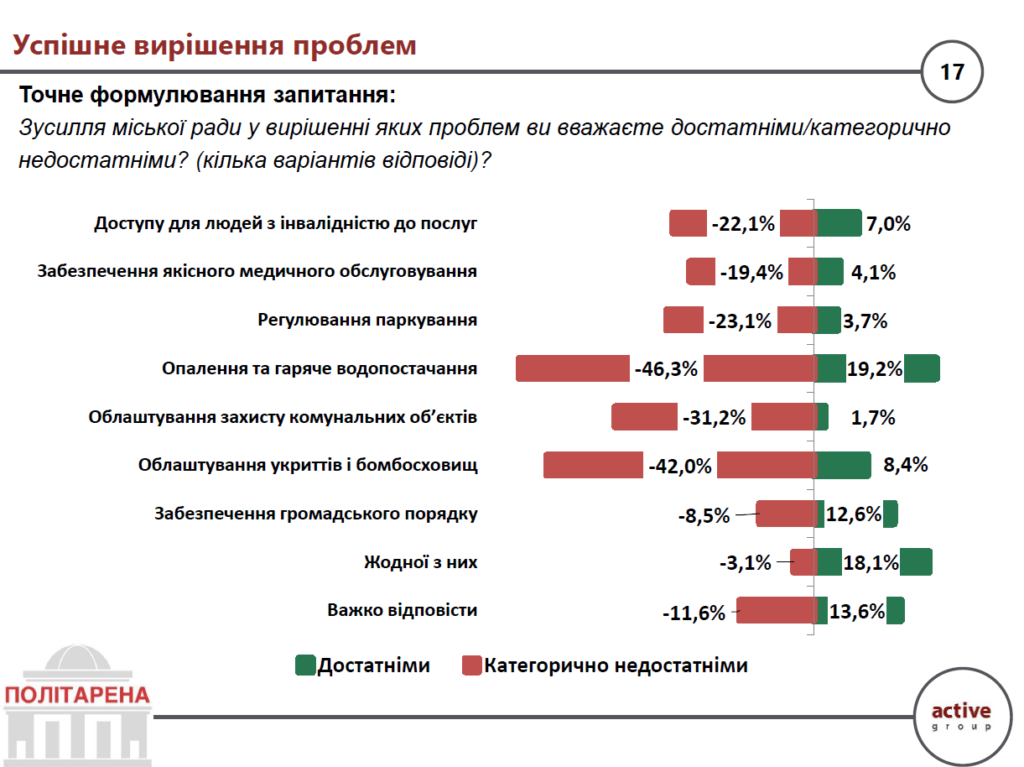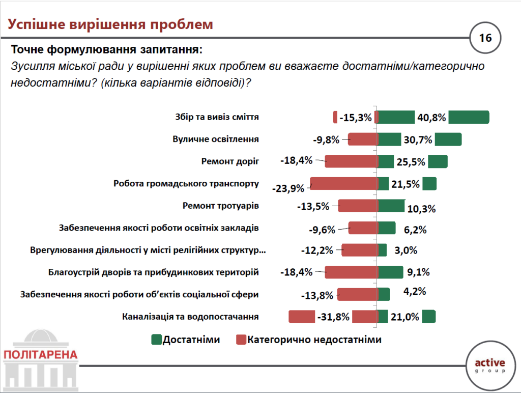 “Окремо варто відзначити, що навіть у сферах, де зафіксовано відносно вищі показники, частка категорично негативних оцінок залишається співставною або перевищує позитивні. Це свідчить не про наявність чітко успішних напрямів, а радше про фрагментарні управлінські успіхи, які не формують цілісного відчуття ефективної роботи міської ради”, – вважають дослдники.