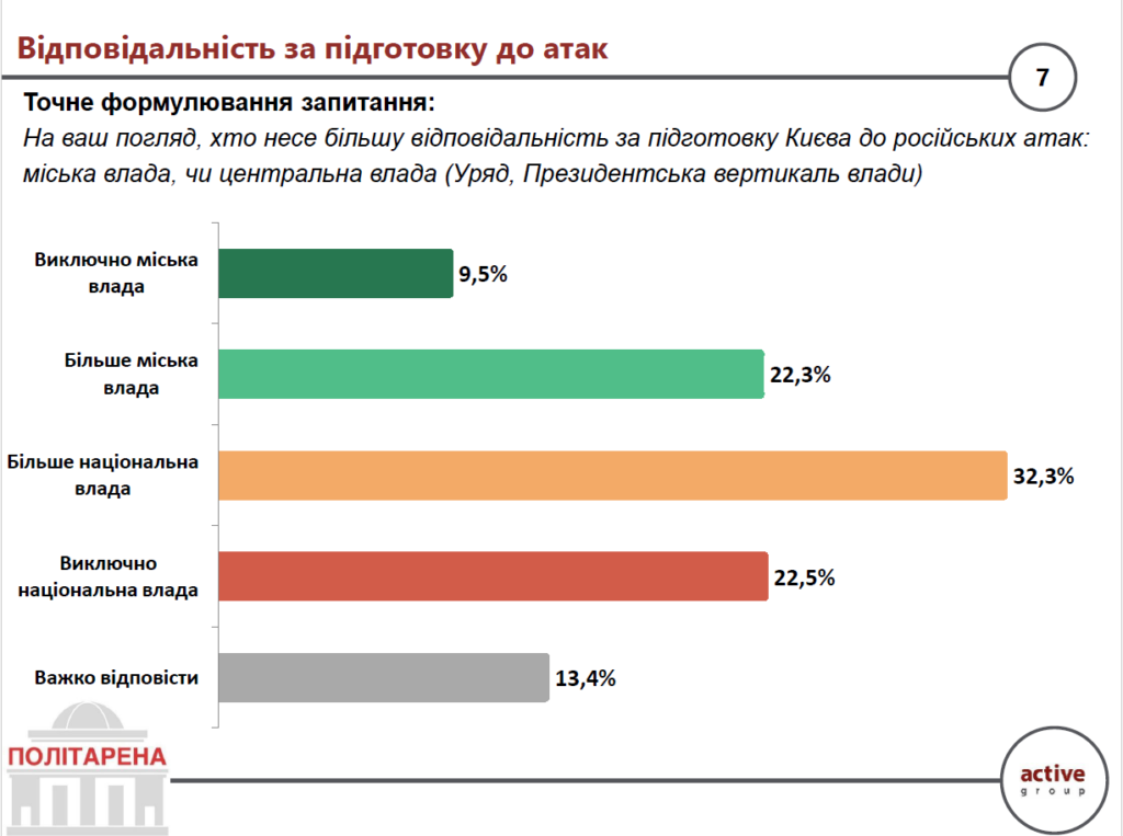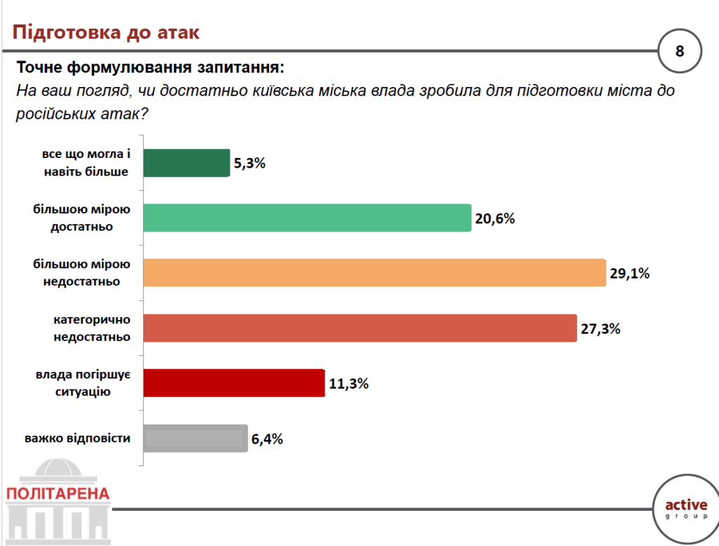 Щодо підготовки Києва до атак, то сукупно 56,4% киян вважають, що влада зробила недостатньо, а 11,3%, що влада навіть погіршує ситуацію.