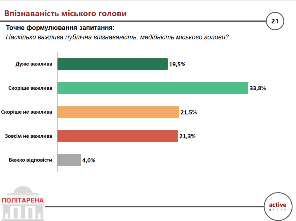 Скоріше не важливою впізнаваність мера назвали 21,5% киян, а 21,3% вважають цей показник взагалі неважливим.