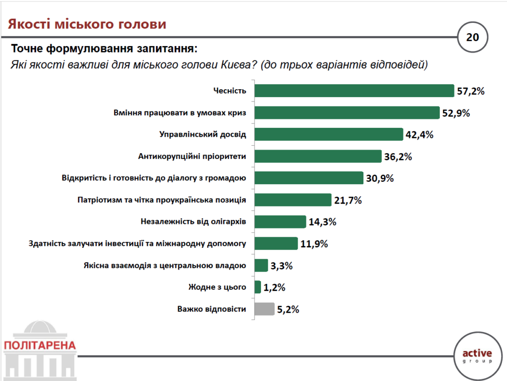 Щодо якостей мера, то 57,2% киян вважають основною якістю чесність, 52,9% – вміння працювати в умовах криз, 42,4% – управлінський досвід, а 36,2% – антикорупційні пріоритети.