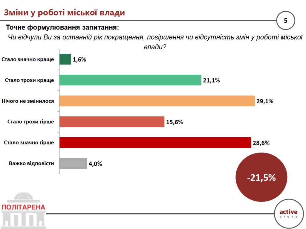 Оцінка змін у роботі міської влади за останній рік фіксує переважно негативну динаміку. Лише 22,7% респондентів помітили певне покращення, тоді як 44,2% вважають, що ситуація погіршилася, з них майже третина (28,6%) говорять про значне погіршення.