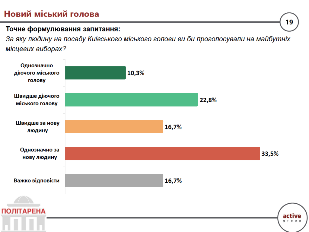 Натомість підтримка чинного мера Віталія Кличка обмежується 33,1%, ще 16,7% не визначилися. Це свідчить не лише про персональну втому, а й про ширший запит на зміну управлінської моделі міста.