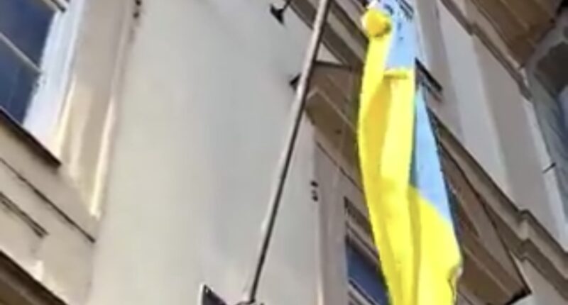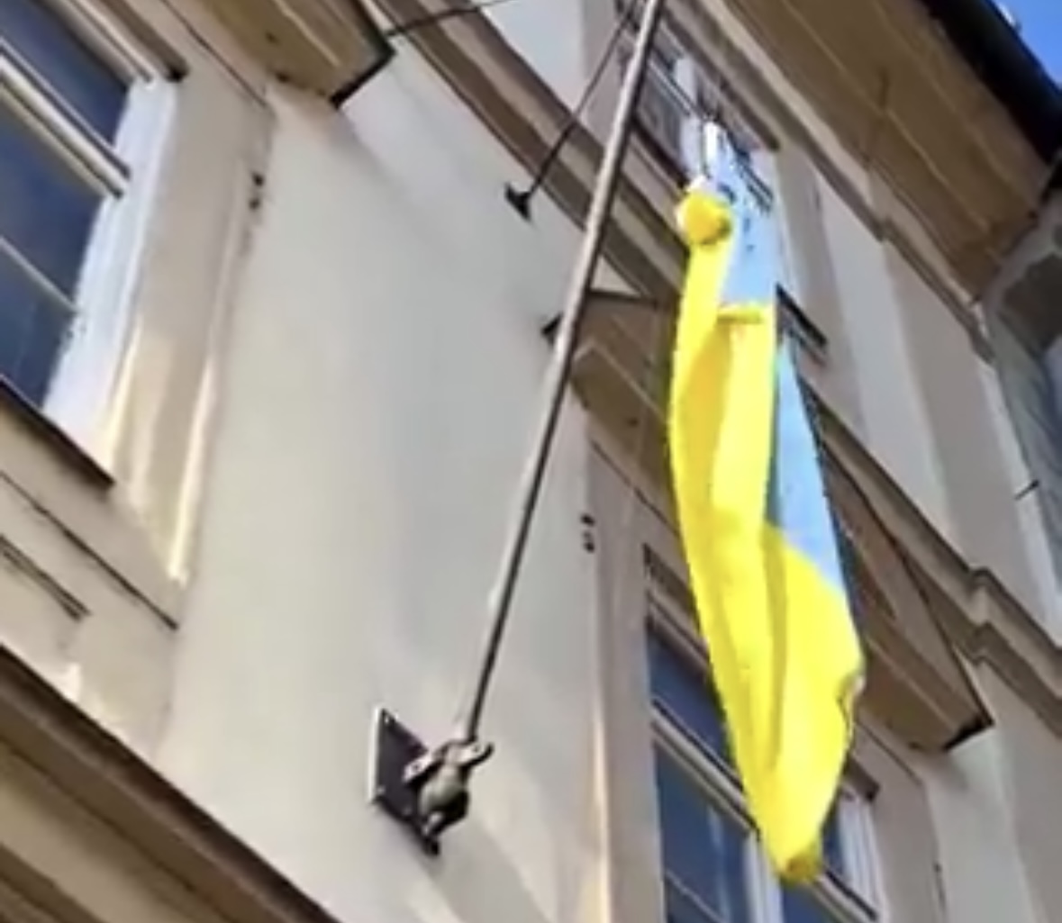 На відео видно, які він тримає драбину для чоловіка, який знімає прапор з фасаду парламенту. Як відомо, його партія вела свою передвиборчу кампанію під гаслом прибирання українських прапорів з будівель державних органів влади та установ.