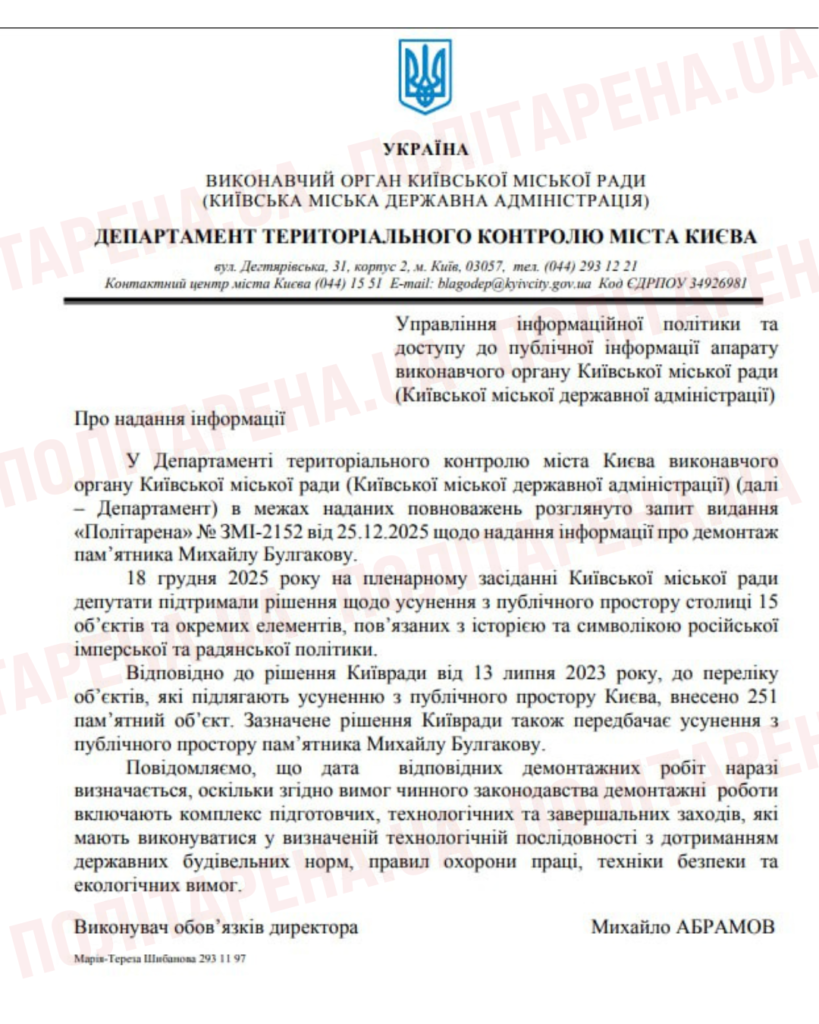 У Києві готують демонтаж пам’ятника російському письменнику Михаїлу Булгакову, дата проведення демонтажних робіт зараз визначається.
