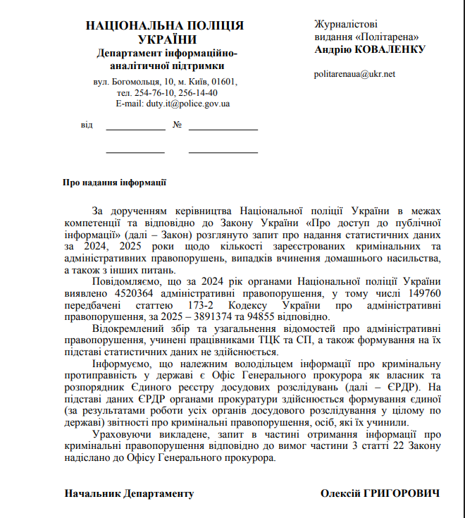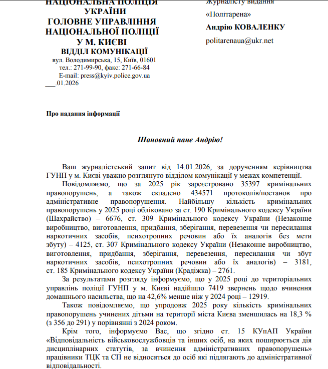 Про це йдеться у відповідях Нацполіції України та Головного управління Нацполіції у Києві на запити “Політарени”.