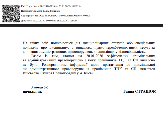 “Разом із тим, станом на 20.01.2026 зафіксованих кримінальних та адміністративних правопорушень з боку працівників ТЦК та СП виявлено не було”, – зазначили в ГУНП у м. Києві.