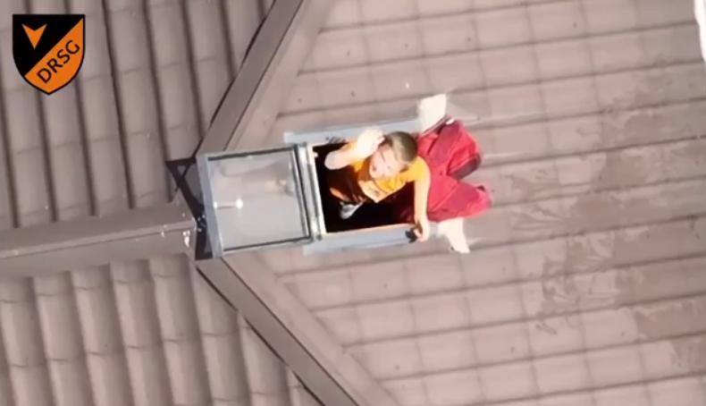 Українські військові записали і оприлюднили відео, як за допомогою дрону їм вдалося передати питну воду жінці з хлопчиком, які сидять на дахе власного будинку.