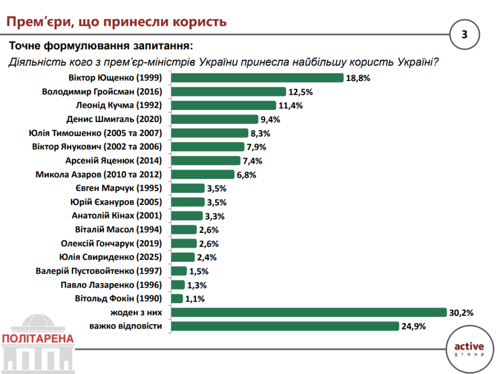Проте набільше респондентів (30,2%) відповіли, що жоден із прем’єрів не приніс користі Україні, ще 24,9% вагалися з відповіддю.