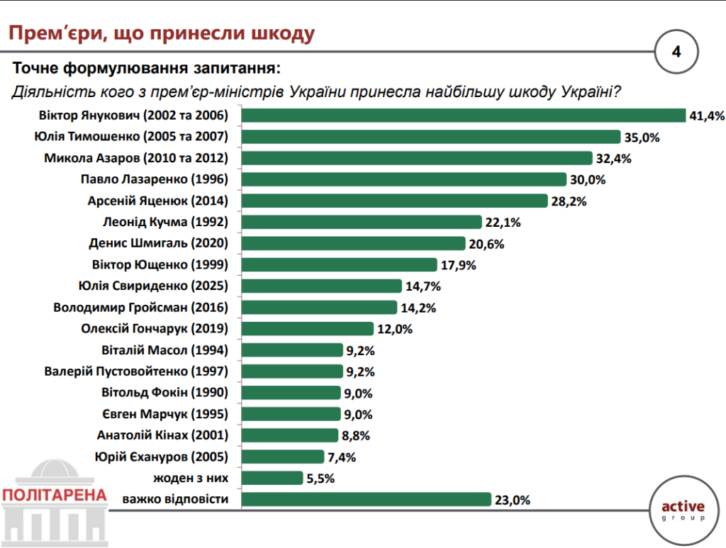 На запитання “Діяльність кого з прем’єр-міністрів України завдала шкоди України?” (із можливістю кількох відповідей) найчастіше згадували Віктора Януковича – 41,4%.