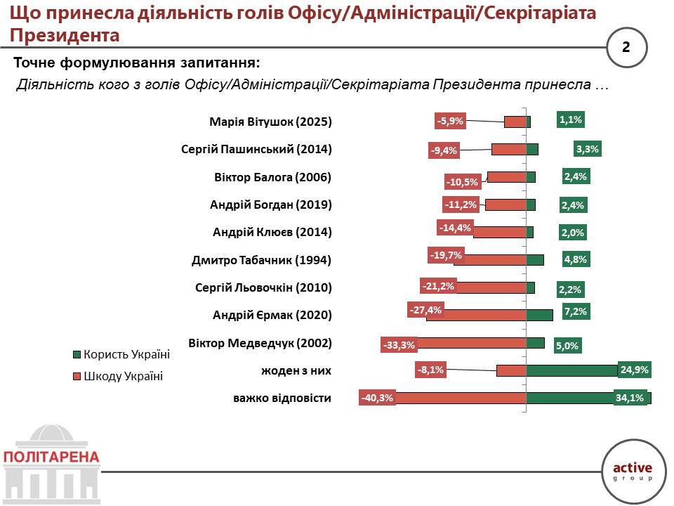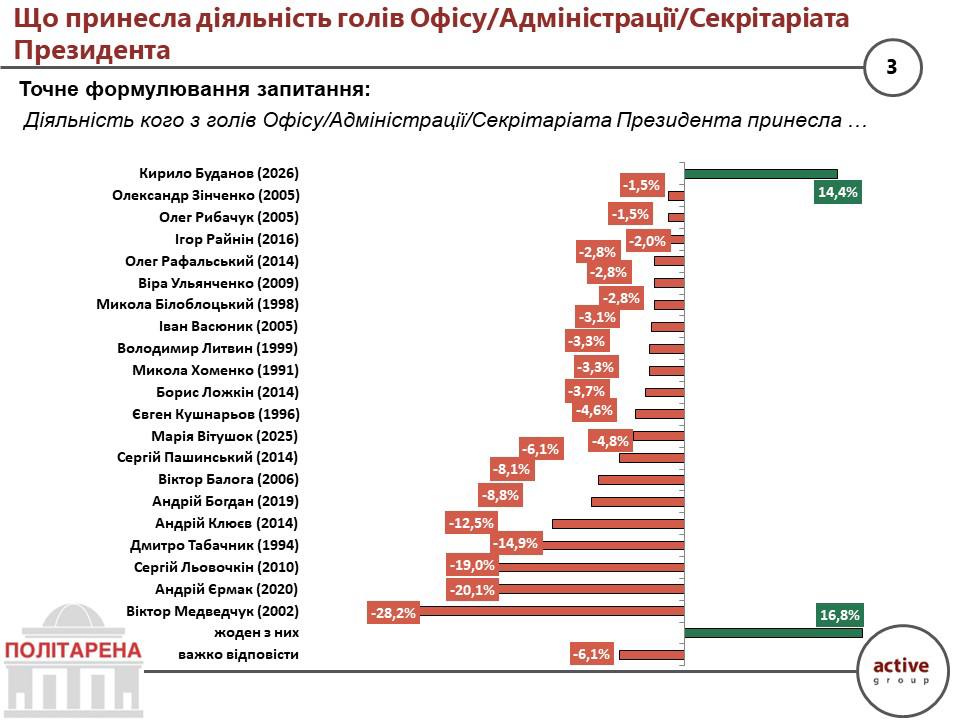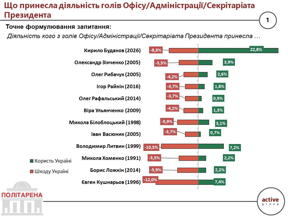 На запитання “Діяльність кого з голів Офісу/Адміністрації/Секретаріата Президента принесла користь чи шкоду Україні?” найкращий баланс продемонстрував Кирило Буданов: 22,8% вважають, що його робота принесла користь Україні, 8,3% – шкоду, що дає позитивний баланс у 14,4%.