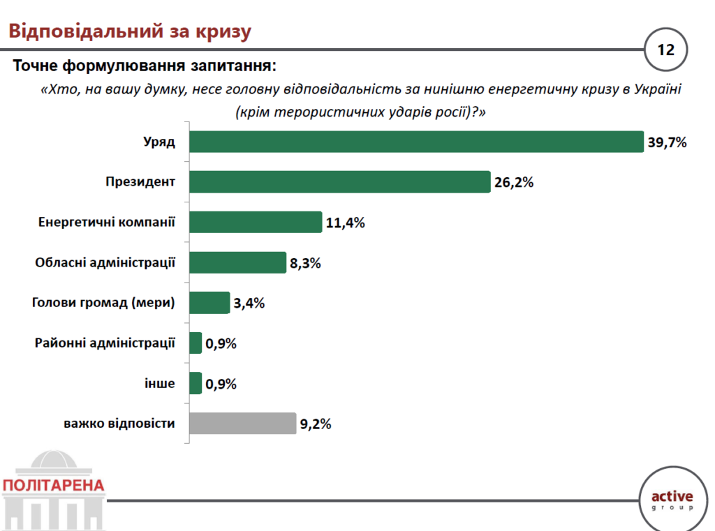 Відповідальність за енергетичну кризу (за винятком російських ударів) українці насамперед покладають на центральну владу: уряд і президента Володимира Зеленського.