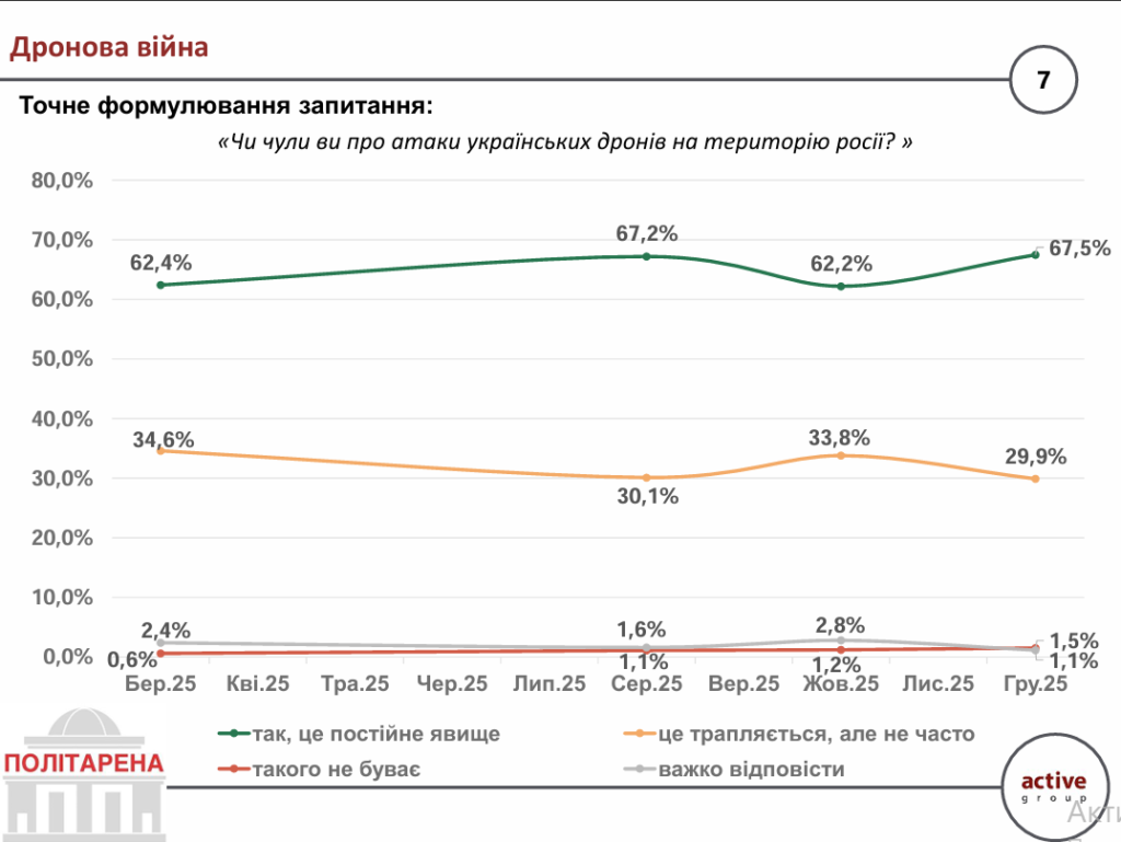 Атаки українських дронів по території Росії стали для більшості українців звичним елементом інформаційного простору. Упродовж 2025 року від 62% до 68% респондентів зазначали, що такі удари є постійним явищем.