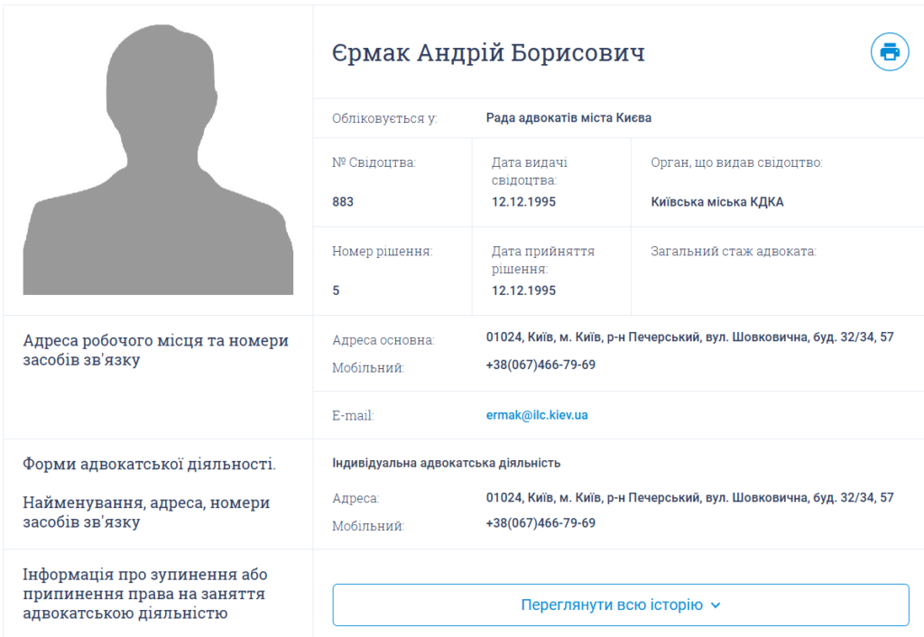 Право Єрмака не адвокатську діяльність відновлено 23 січня 2026 року на підставі його заяви. Після призначення керівником Офісу президента Єрмак написав заяву про зупинку цього права з 20 лютого 2020 року .