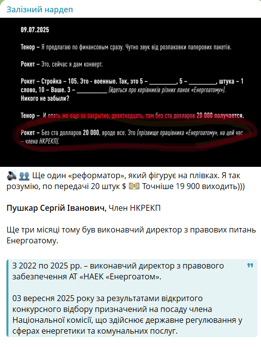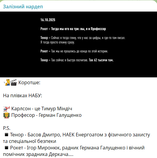 “Карлсон – це Тимур Міндіч, Професор – Герман Галущенко, Тенор – Басов Дмитро, НАЕК Енергоатом з фізичного захисту та спеціальної безпеки, Рокет – Ігор Миронюк, радник Германа Галущенко і вічний помічник зрадника Деркача. Ще один “реформатор”, який фігурує на плівках. Пушкар Сергій Іванович, Член НКРЕКП”, – стверджує Железняк.